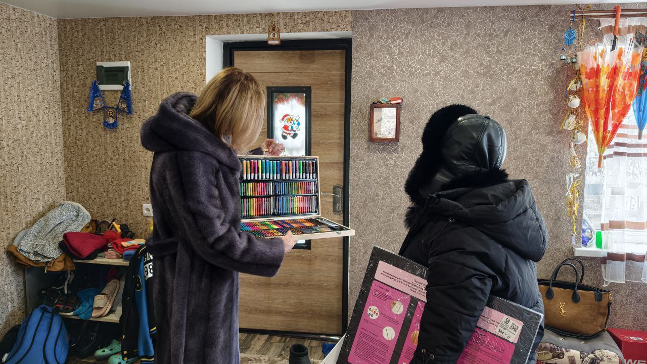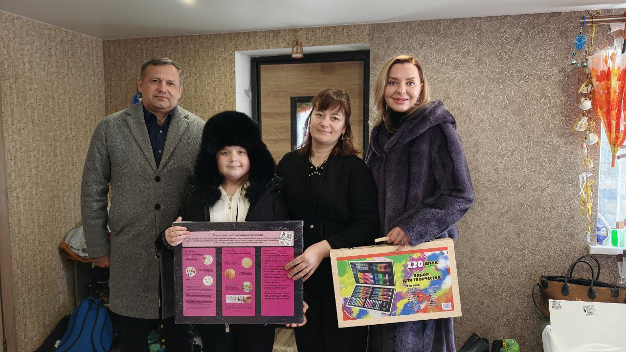 Депутат областной Думы от Единой России вместе с председателем местного совета депутатов Алексеем Козубским передала подарок участнице акции «Ёлка желаний». Девочка увлекается творчеством, очень любит рисовать, поэтому подарили ей необходимые принадлежности для ее хобби: картину по номерам, холсты, набор карандашей и фломастеров.