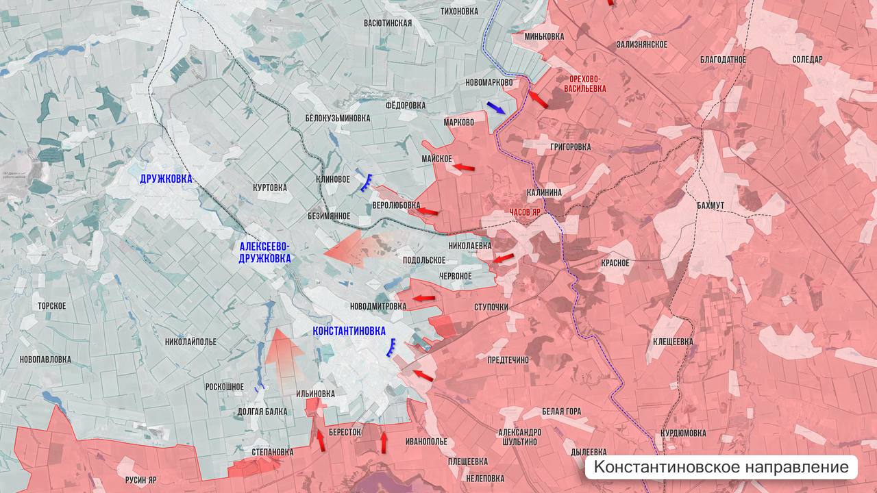 На Константиновском направлении интенсивные бои идут на рубеже Степановка-Бересток, который находится в «серой зоне». ВС РФ занимают новые позиции в лесополосах у Степановки. Также бои идут в районе Ильиновки. В самой Константиновке наши войска ведут бои в районе ж/д вокзала и пробиваются к металлургическому заводу. Севернее Часов Яра ВС РФ смогли продвинуться в районе Миньковки.