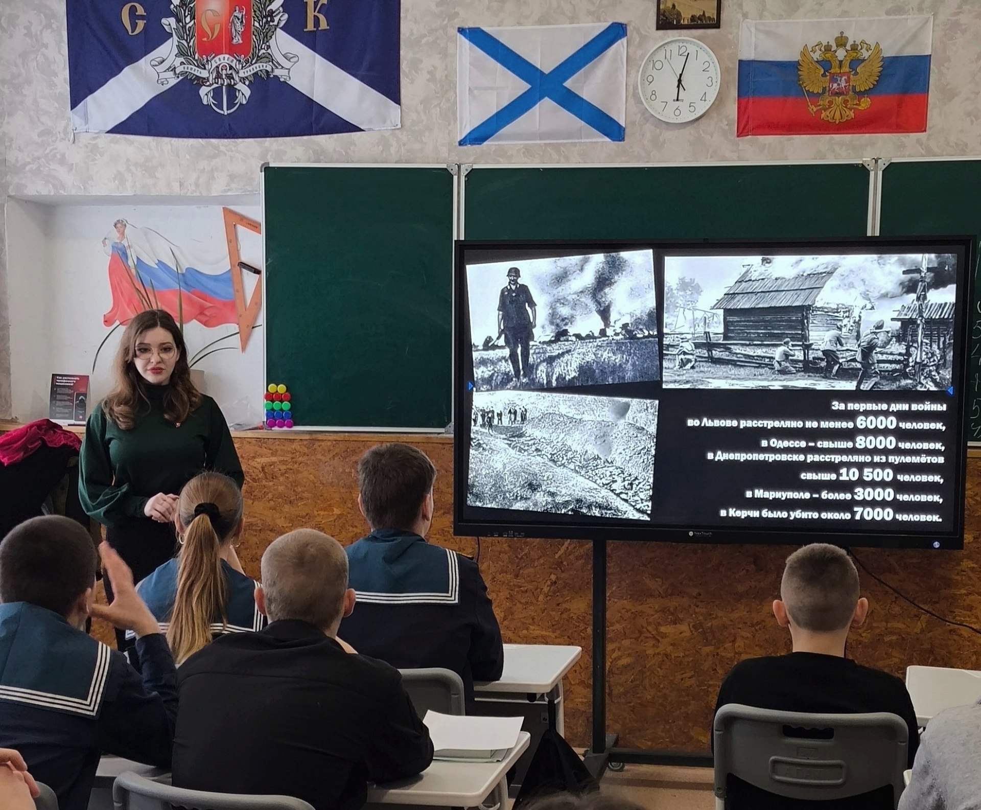 В ходе выступления совместно с ребятами был подробно изучен вопрос природы фашизма и то, какие последствия имеет его распространение. Поговорили о последствиях вторжения в Советский Союз немецко-фашистских полчищ. Особое внимание было уделено режиму оккупации Херсона: вспомнили и 3 концлагеря для советских военнопленных, и виселицу на улице Суворова, и угнанных в рабство в Германию тысячах юношей и девушек.