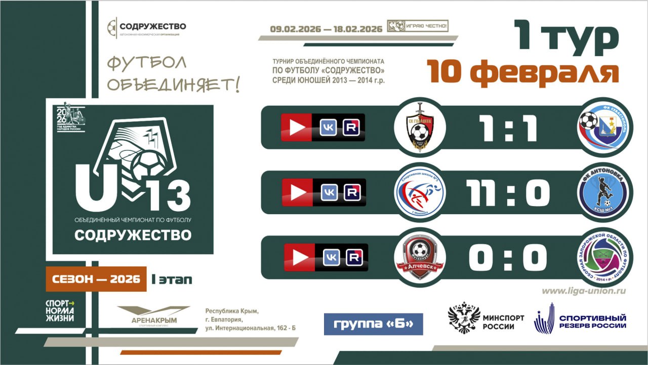 10 февраля 2026 года в г. Евпатория состоялись матчи 1 тура I этап турнира Объединённого чемпионата по футболу «Содружество» среди детей 2013-2014 годов рождения (U-13).