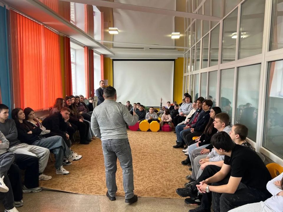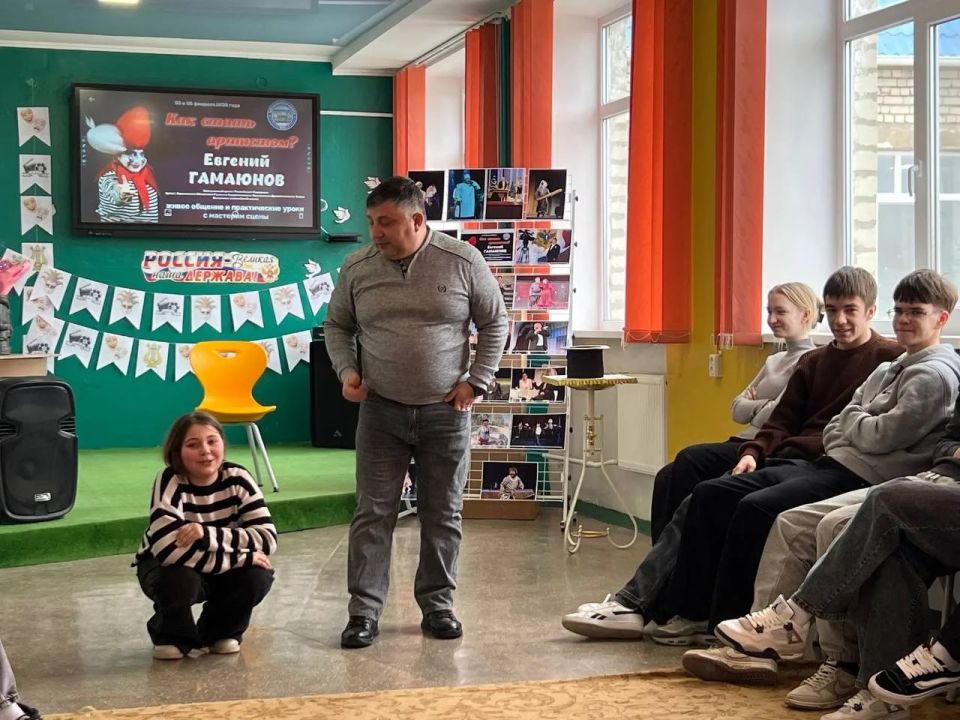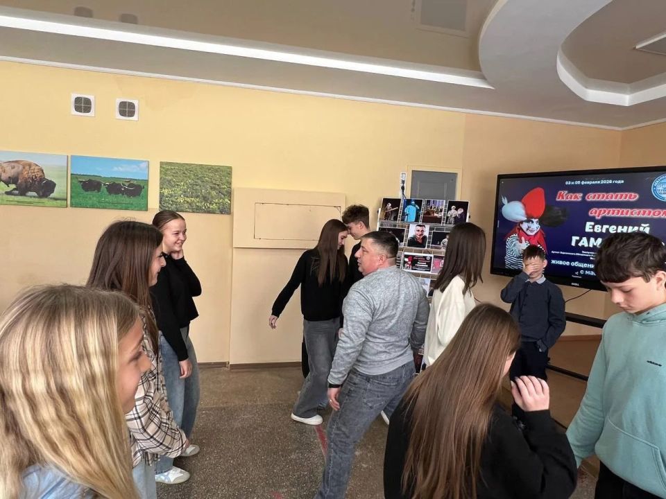 Евгений Николаевич поделился со школьниками историями из жизни и профессионального пути, вкратце рассказал о развитии театрального искусства, о своих ролях, курьёзных случаях на сцене, а также ответил на вопросы ребят.