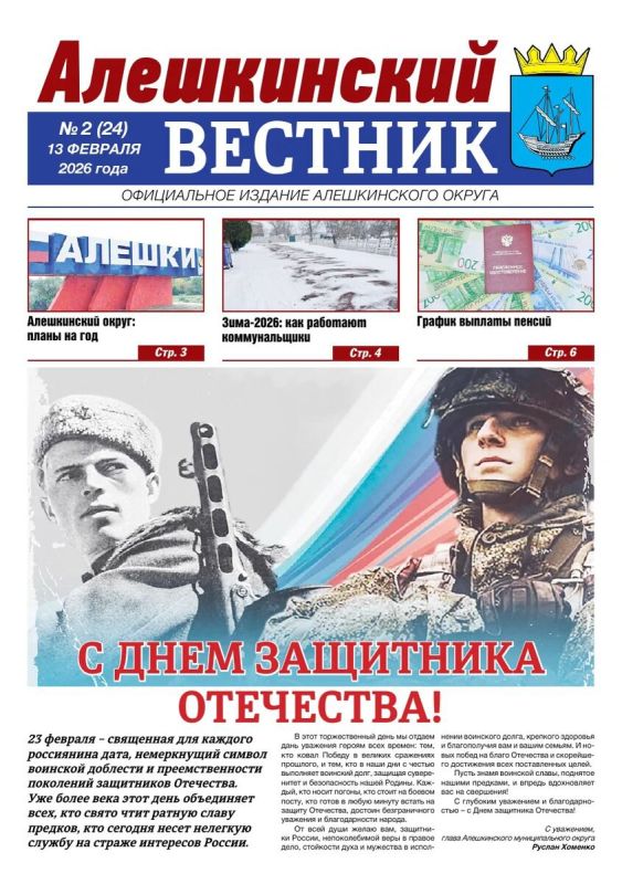 Глава округа Руслан Хоменко поздравил жителей с Днём защитника Отечества, Сретением и Масленицей – обращение к землякам и поздравления с праздниками, стр. 1–2.