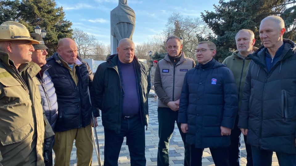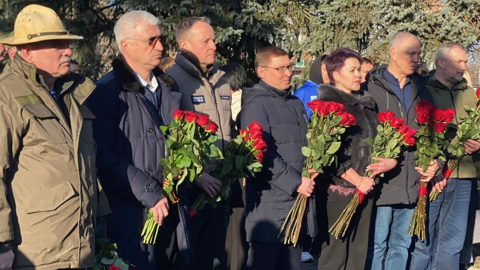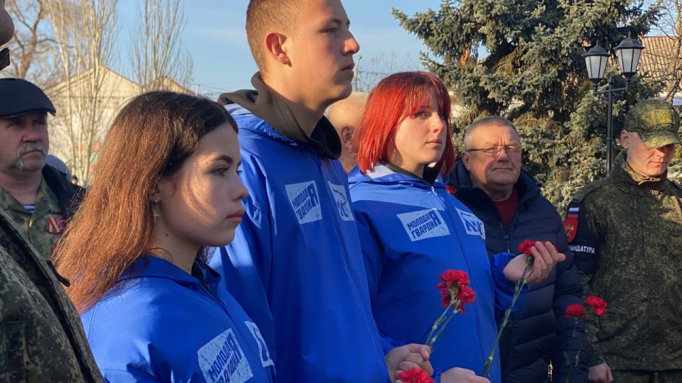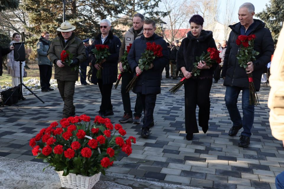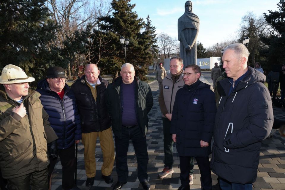 Владимир Якушев вместе с ветеранами Афганской войны, участниками специальной военной операции, Херсонским областным отделением «Боевого Братства», молодогвардейцами возложили цветы к расположенному в сквере «Воинской славы» в Геническе монументу «Скорбящая мать».
