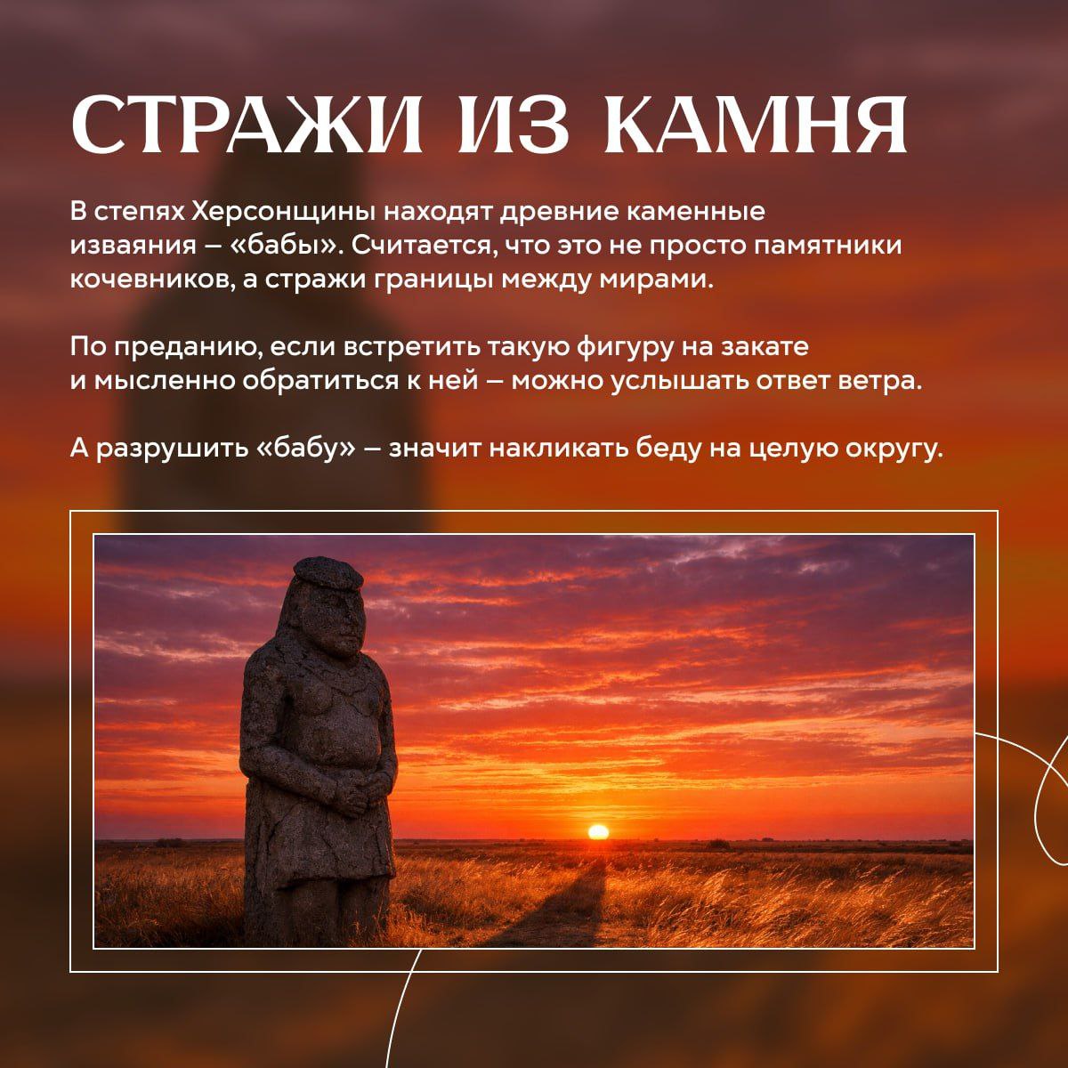 Херсонская степь кажется спокойной и бескрайней. Но стоит прислушаться — и она начинает рассказывать: о древних курганах, кочевниках, солёных водах и каменных стражах, которые пережили века. Здесь ветер — как проводник в прошлое, а закат превращает пейзаж в легенду.