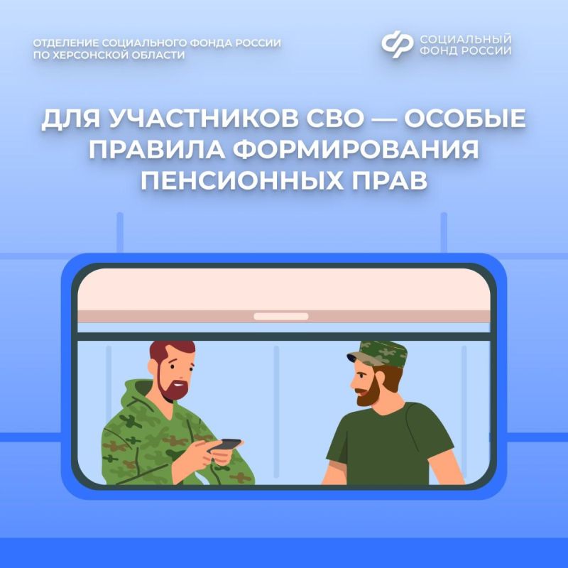 Отделение СФР по Херсонской области напоминает: время участия в специальной военной операции дает право на льготное исчисление стажа и повышенные пенсионные коэффициенты.