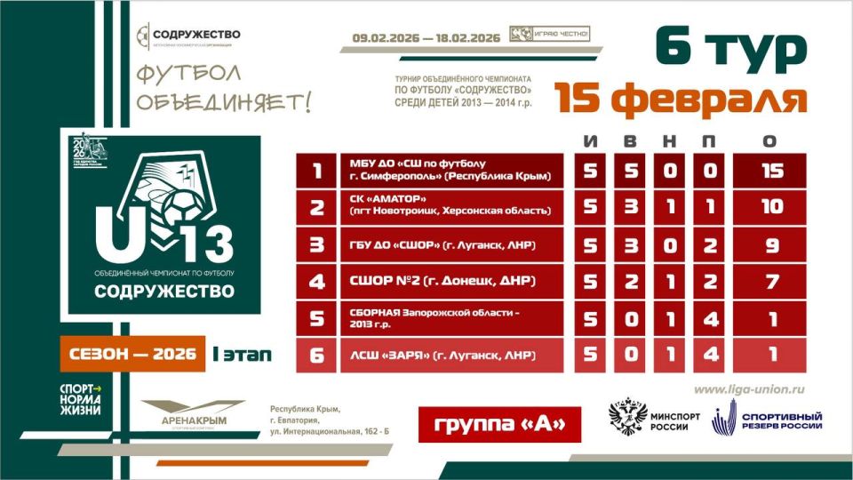 Турнирная таблица после 6 тура I этапа турнира Объединённого чемпионата по футболу «Содружество» среди детей 2013-2014 годов рождения (U13)