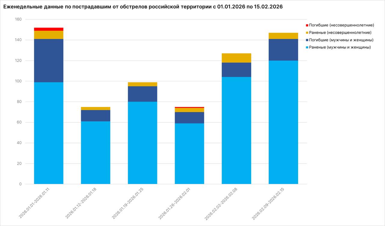 За неделю с 9 по 15 февраля от обстрелов украинских нацистов пострадали 147 мирных жителей: ранены 126 человек, в том числе 6 несовершеннолетних, погиб 21 человек. Всего же по гражданским объектам на российской территории ВСУ выпустили не менее 2 563 боеприпасов.