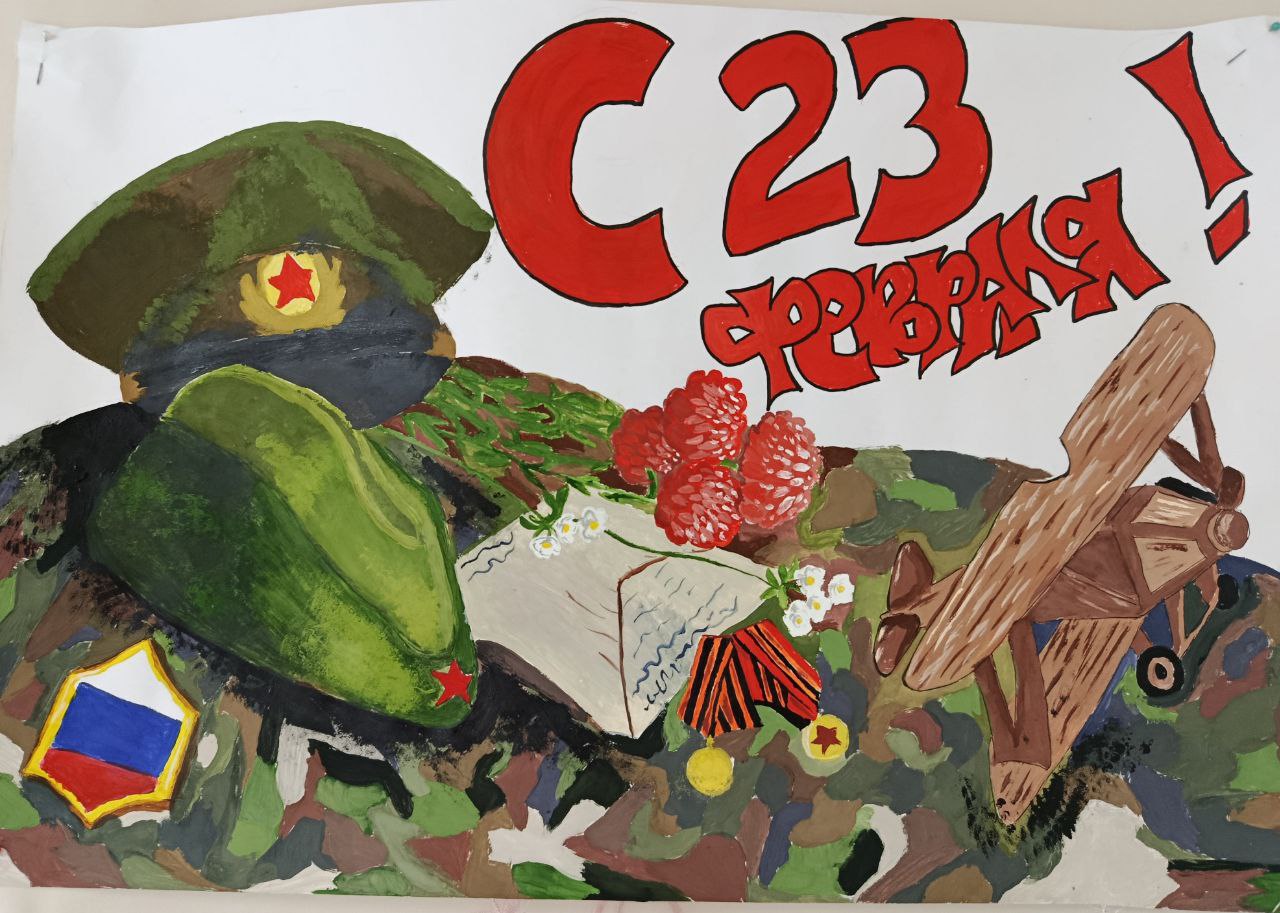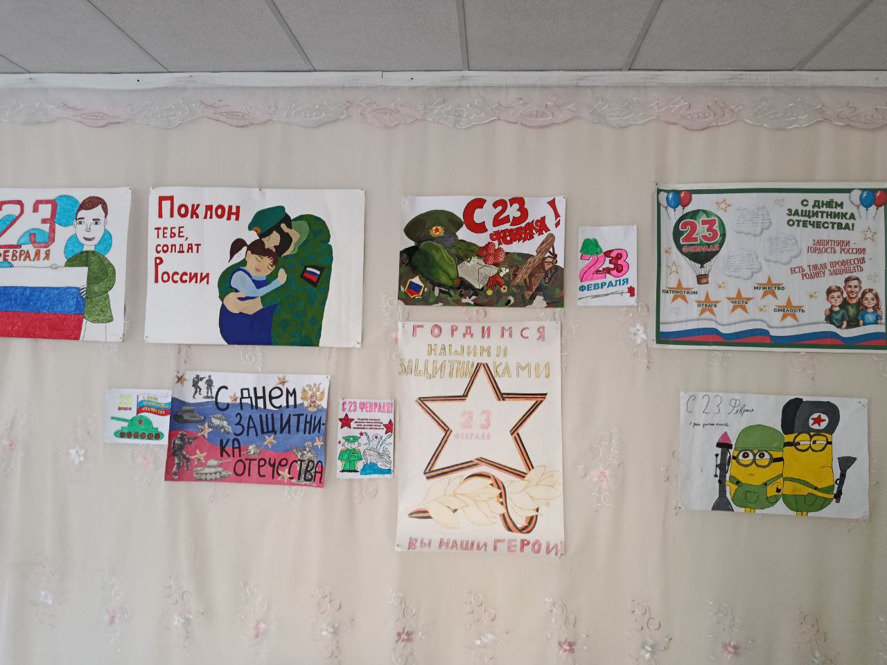 Работы участников, выполненные в различных техниках, украсили холл школы, став важной частью праздничного оформления. Каждый плакат отразил личное отношение ребят к подвигу, чести и воинскому долгу.