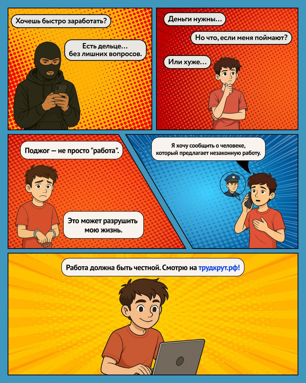 В этом комиксе герой делает единственно правильный выбор: он понимает, что его пытаются втянуть в преступление, прекращает общение и сообщает в полицию. А работу ищет там, где она действительно легальная — на сайте трудкрут.рф.