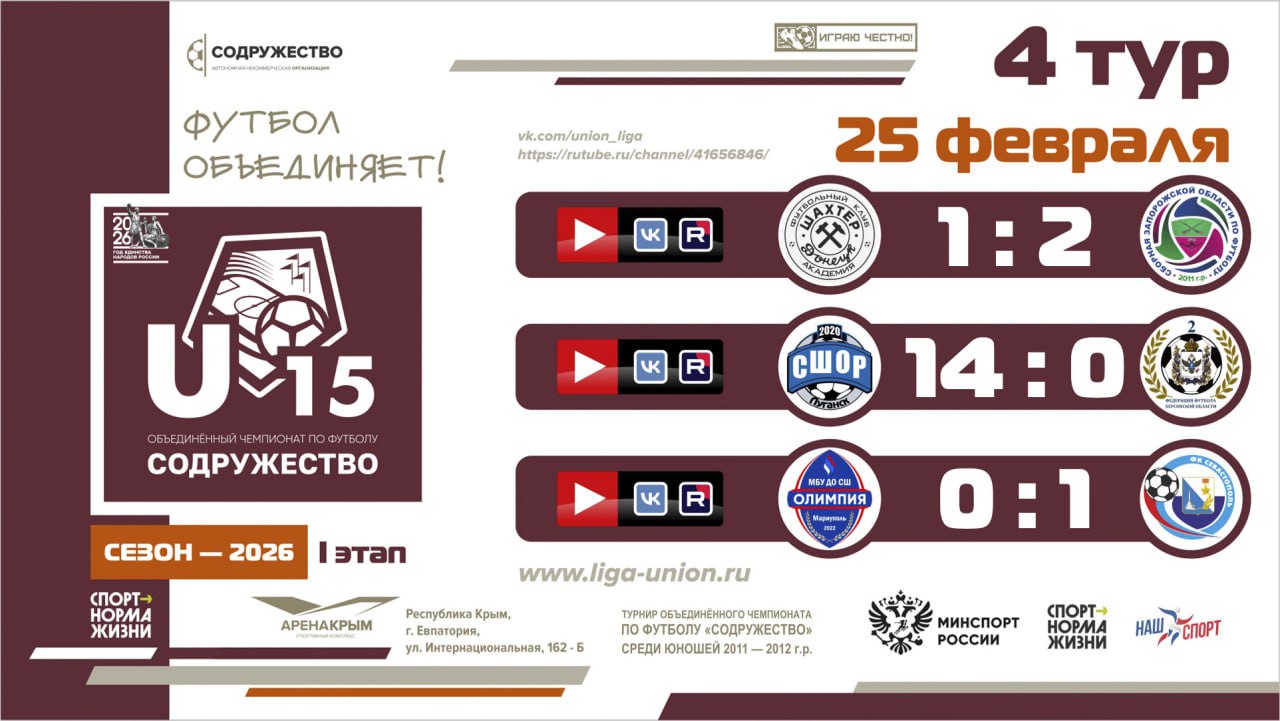 25 февраля 2026 года в г. Евпатория состоялись матчи 4 тура I этапа турнира Объединённого чемпионата по футболу «Содружество» среди юношей 2011-2012 годов рождения (U-15).