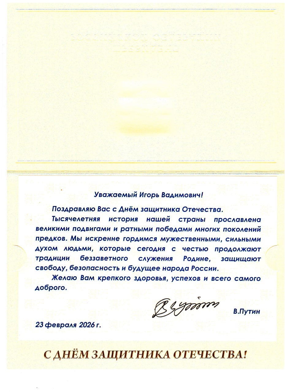 Поздравление Президента Российской Федерации Владимира Владимировича Путина с Днем защитника Отечества