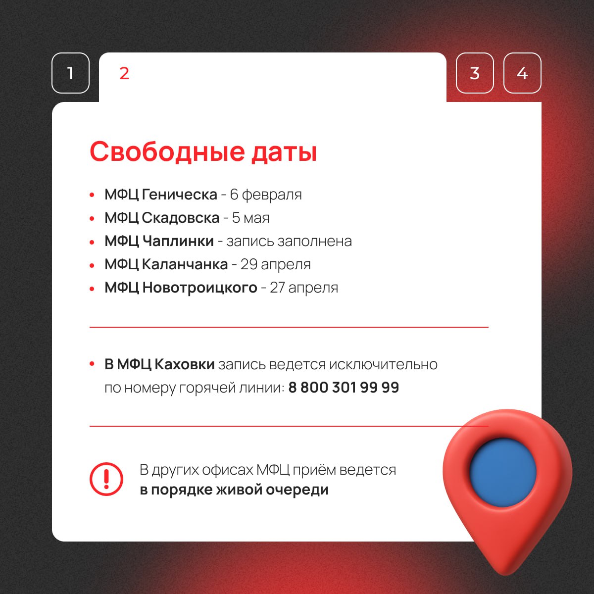 Если не обнаружили свободных дат для записи в отделении рядом, то рекомендуем осуществлять периодический мониторинг раздела «предварительная запись» в чат-боте.