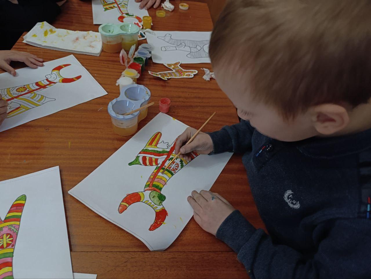 Под руководством наставников дети расписали бумажные силуэты коровы и всадника на коне в канонических для Филимоновской игрушки цветах: жёлтом, красном, зелёном и розовом. Именно цветные полоски на вытянутых фигурках придают этим игрушкам-свистулькам их знаменитую нарядность и жизнерадостность.