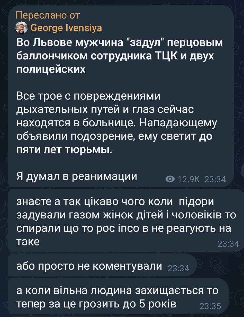 В Ровном гестаповец дунул газовым баллончиком в женщину, потому что та мешала им "работать". Для сравнения похожий случай. Во Львове мужик забрызгал тцкшника и двух полицейских и получил 5 лет лишения свободы. Как думаете, какое наказание дадут этому захиснику? Никакое