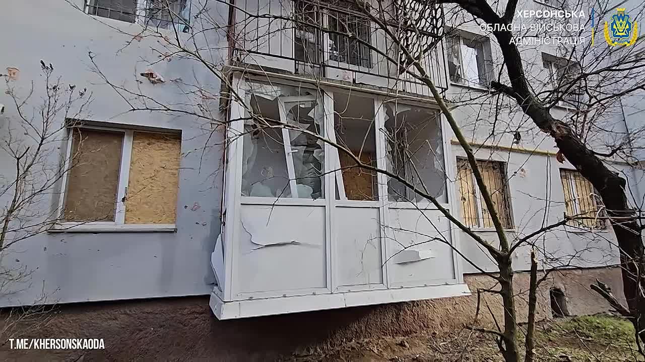 Власти правобережья публикуют видео-последствия вчерашнего обстрела Корабельного района Херсона.