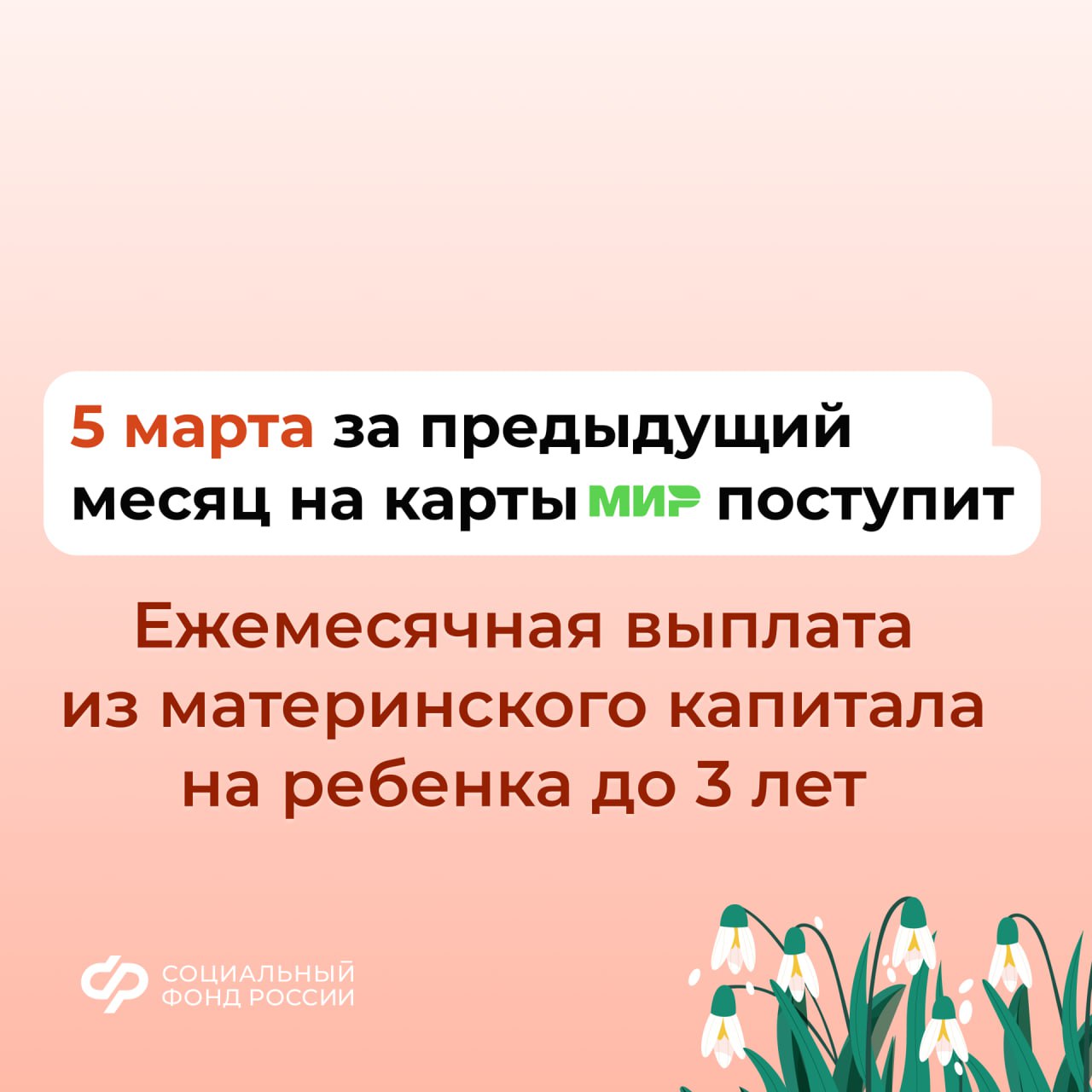 Перечисления осуществляются в новом месяце за предыдущий. Это значит, что в марте вы получаете пособия за февраль. Обратите внимание, деньги зачисляются в течение всего дня. Если пособия не поступят на счет утром, нужно дождаться поступления средств до окончания дня.