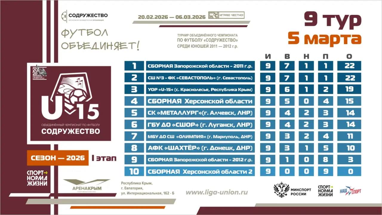Турнирная таблица после 9 тура I этапа турнира Объединённого чемпионата по футболу «Содружество» среди юношей 2011-2012 годов рождения (U15)