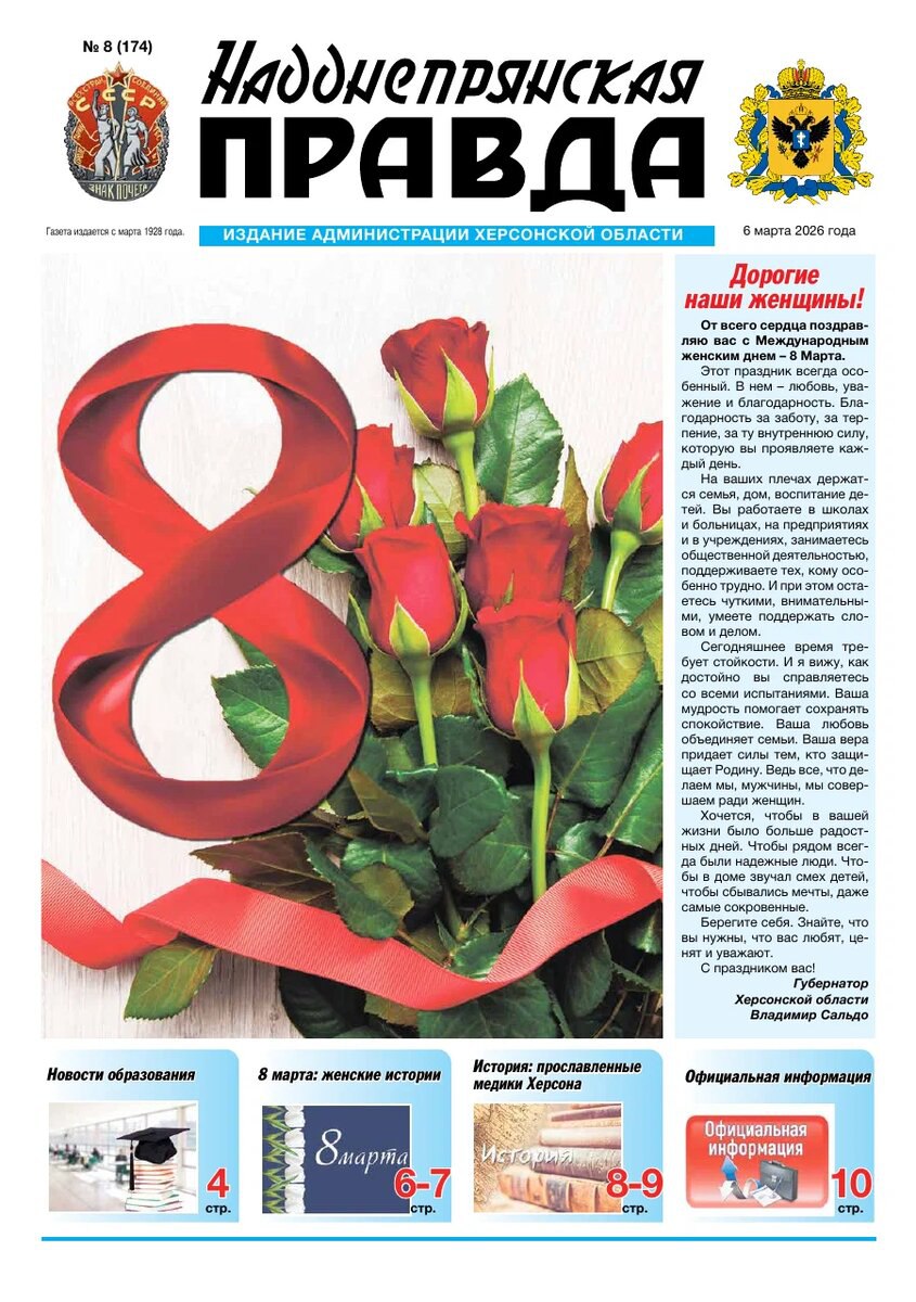 С 8 Марта! Поздравление губернатора Владимира Сальдо – тёплые слова благодарности женщинам Херсонщины за заботу, стойкость и любовь, стр. 1.
