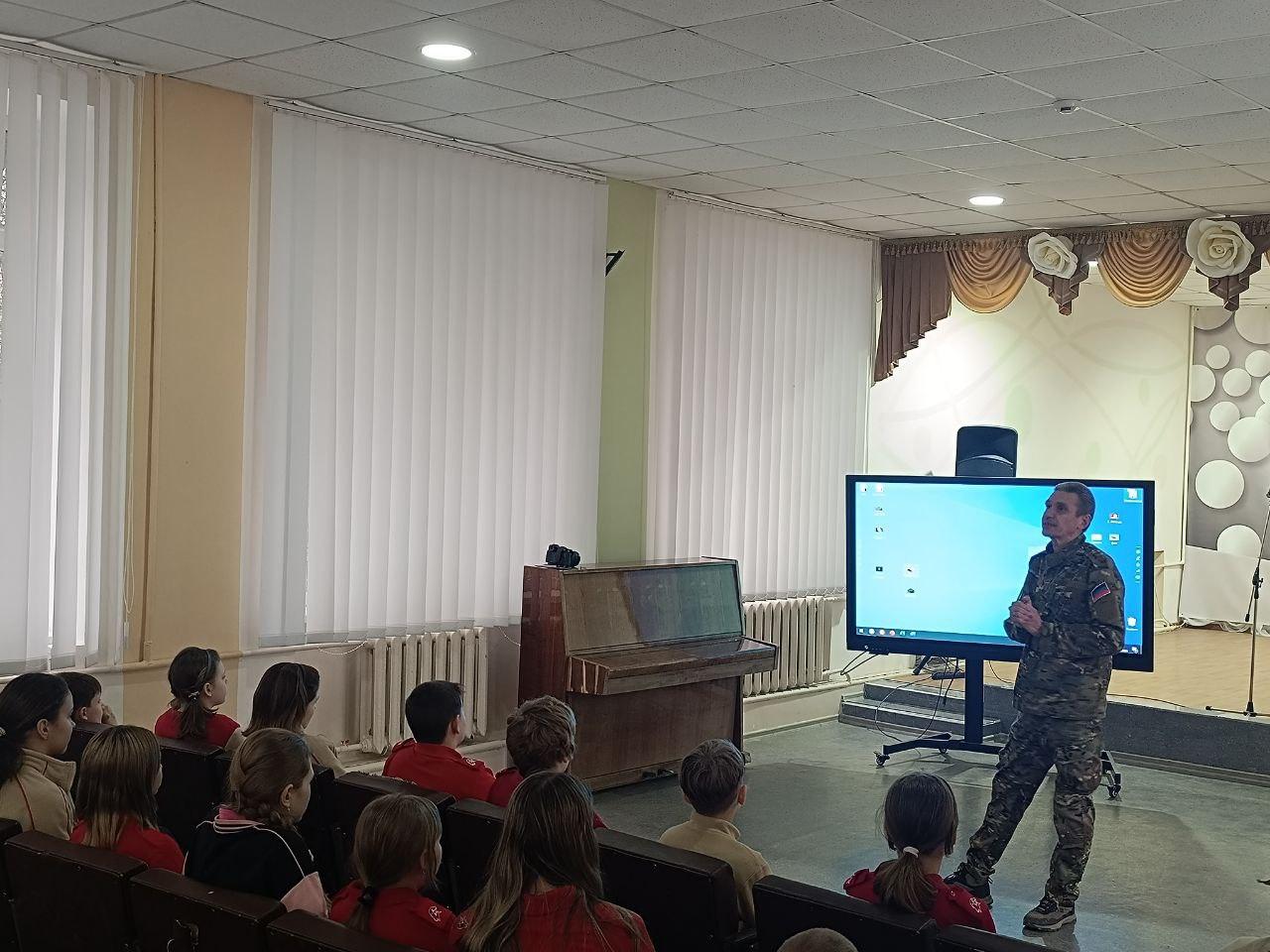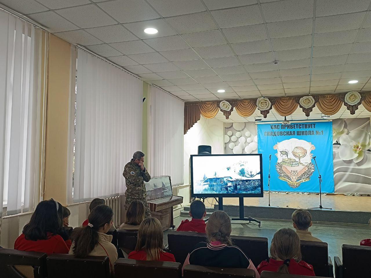 О событиях, произошедших 12 лет назад на Донбассе, школьникам рассказал руководитель Скадовского отделения ветеранской организации «Боевое братство» Андрей Дворецкий, являющийся непосредственным участником как событий «Русской весны», так и боевых действий на Донбассе.