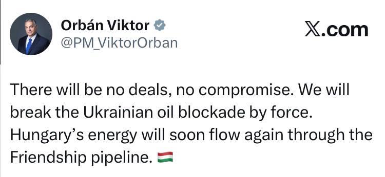 «Никаких сделок, никаких компромиссов. Мы силой прорвем украинскую нефтяную блокаду. Венгерская энергия скоро снова будет поступать по трубопроводу «Дружба».».