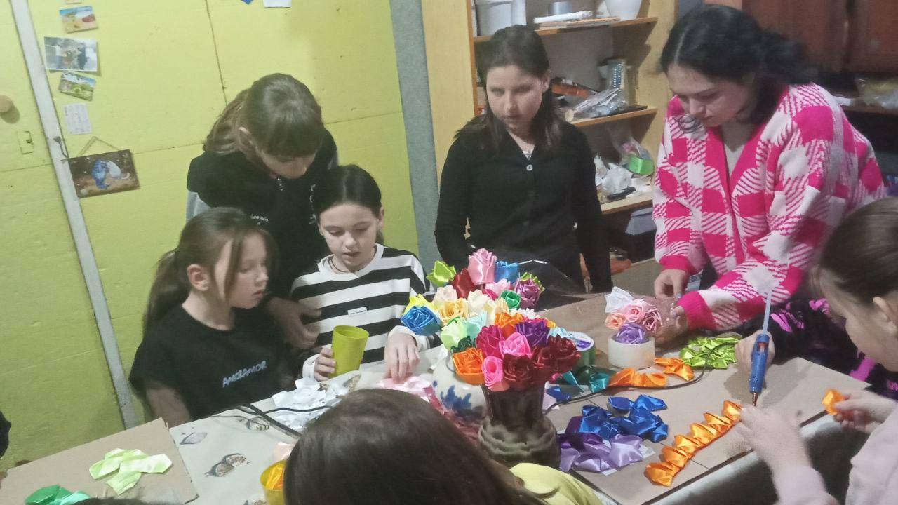 Ребята с большим энтузиазмом мастерили для своих любимых мам букеты из атласных лент. Каждый ребёнок тщательно подбирал цвета и сочетания, создавая уникальные композиции и проявляя творческую фантазию.