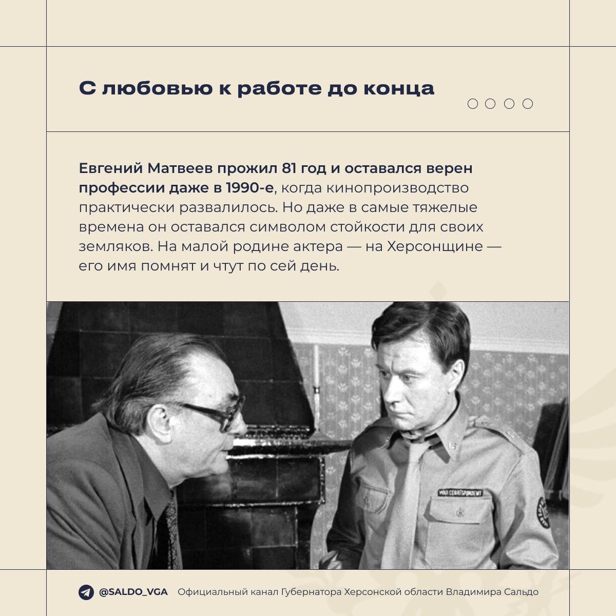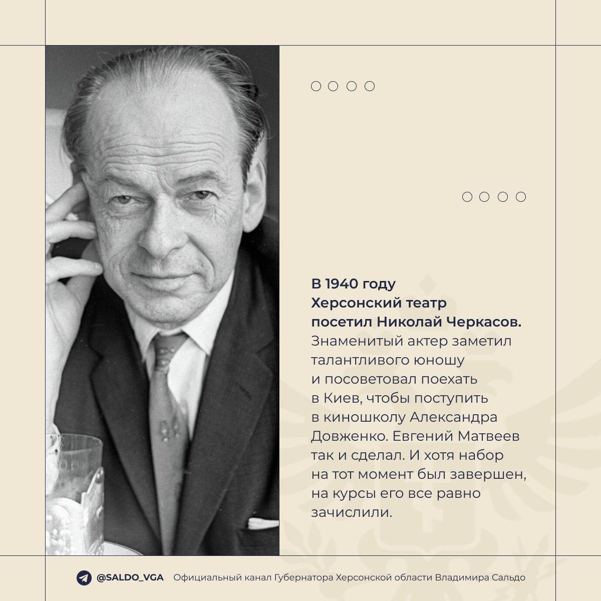 Сегодня вспоминаем нашего земляка — великого артиста Евгения Семёновича Матвеева. Он родился 8 марта 1922 года в селе Новоукраинка на территории нынешнего Скадовского района Херсонской области