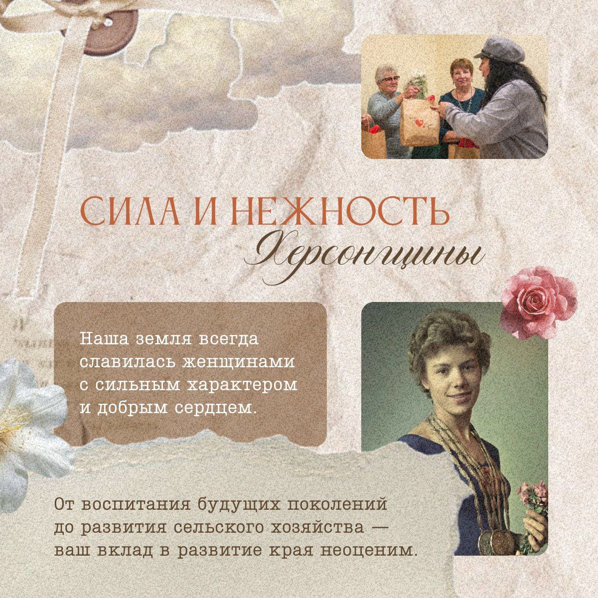 Херсонская земля всегда славилась сильными, мудрыми и добрыми женщинами. Вы воспитываете детей, лечите людей, развиваете города и сёла, сохраняете традиции и создаёте будущее. В вашей силе — характер, в вашей доброте — душа нашего края.