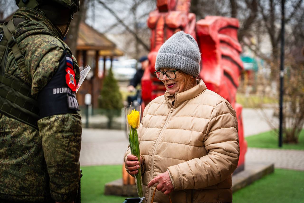 Сегодня на улицах города было особенно тепло. Наши бойцы, которые каждый день стоят на страже, нашли время для главного — для прекрасной половины. Цветы, добрые слова и искренние улыбки.
