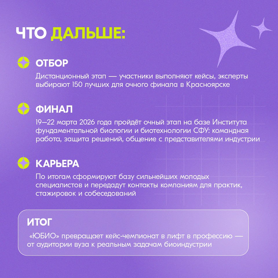 Как устроен путь от подачи заявки до очного финала в Красноярске, какие направления задействованы и почему «ЮБИО» — это не разовое событие, а старт карьерной траектории для сотен студентов, читай в карточках. И да, свои «а если я из другого региона?» и «как собрать команду?» задать Диане можно в комментариях.