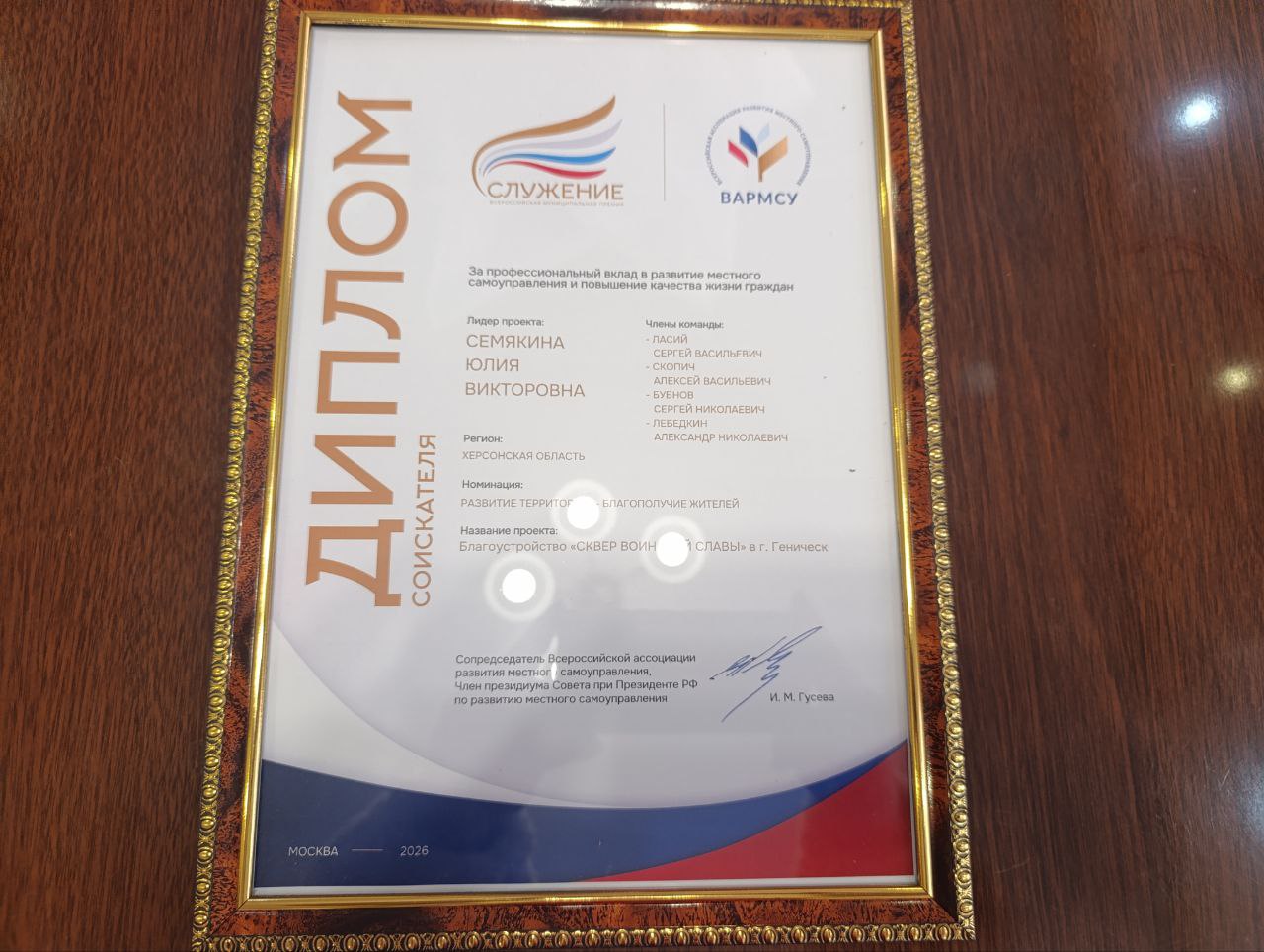 Особенно приятно, что труд нашей команды был отмечен на федеральном уровне. Команда округа под руководством главы Юлии Семякиной награждена Дипломом соискателя премии от Всероссийской ассоциации развития местного самоуправления (ВАРМСУ) за профессиональный вклад в развитие местного самоуправления и повышение качества жизни граждан. На соискание всего поступило 61 460 заявок, как индивидуальных, так и командных.