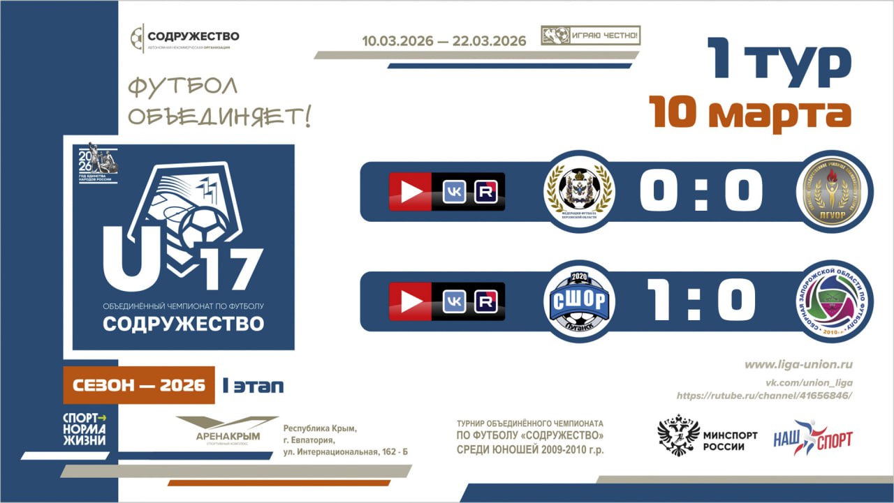 10 марта 2026 года в г. Евпатория состоялись матчи 1 тура I этапа турнира Объединённого чемпионата по футболу «Содружество» среди юношей 2009-2010 годов рождения (U-15).