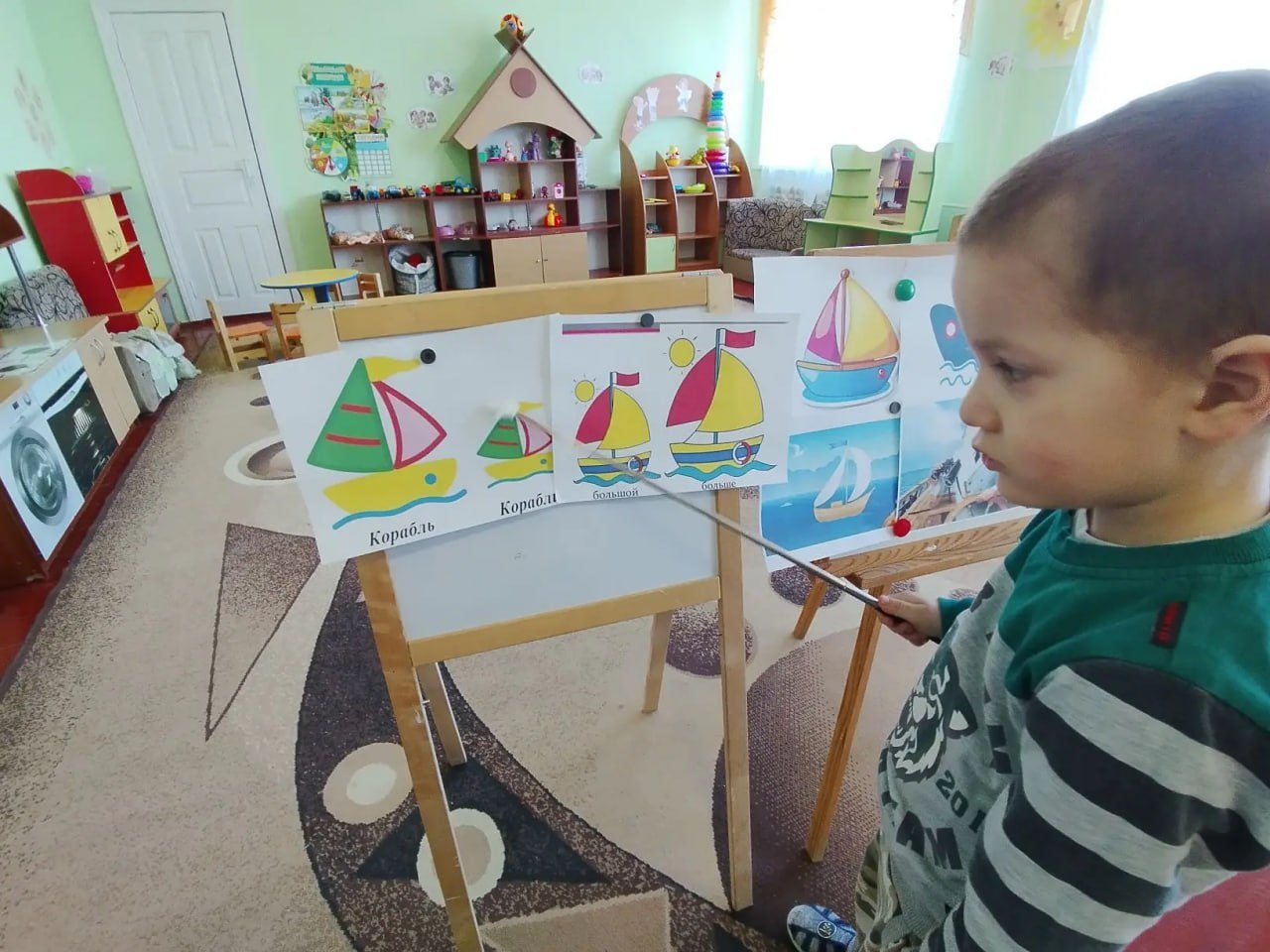 Воспитатели в игровой форме, с применением в качестве визуальных образов изображений кораблей, объяснили малышам основные математические аспекты. Дети научились на слух различать понятие «один» и «много», узнали геометрические особенности фигур, на примерах парусов кораблей, потренировались различать размер фигур.