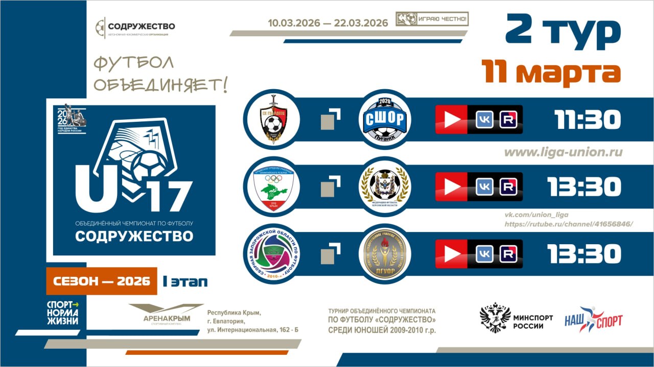 11 марта 2026 года в г. Евпатория пройдут игры второго тура I этап турнира Объединённого чемпионата по футболу «Содружество» среди юношей 2009-2010 годов рождения (U-17).