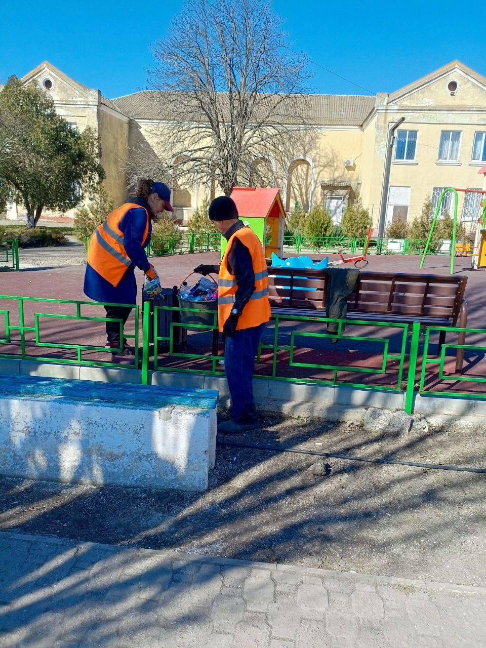 с. Счастливцево: Санитарная уборка в парке, на клумбах в центре села, чистка урн.
