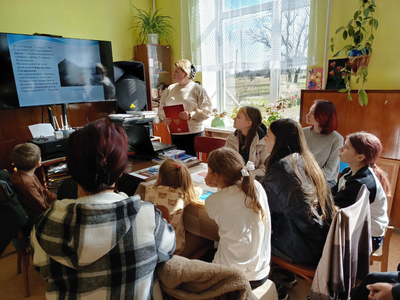 Для детей и подростков начальник отдела клуба Татьяна Демиденко подготовила и провела час истории с показом мультимедийной презентации «Освобождение Херсона».