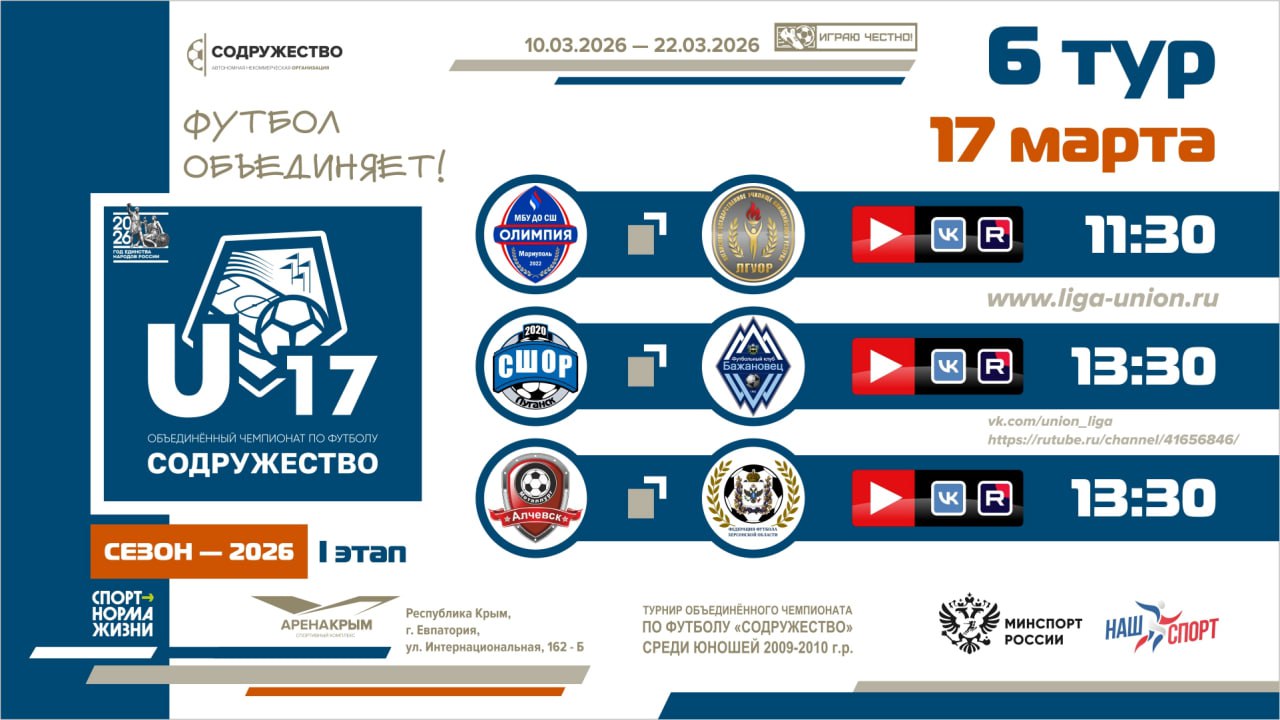 17 марта 2026 года в г. Евпатория пройдут игры шестого тура I этап турнира Объединённого чемпионата по футболу «Содружество» среди юношей 2009-2010 годов рождения (U-17).