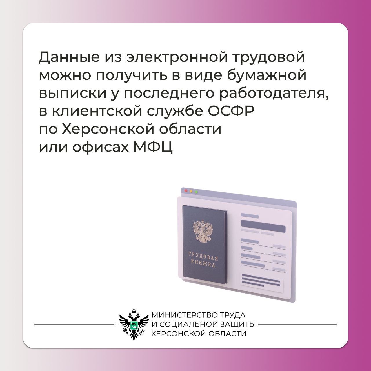 Доступ к своей электронной трудовой книжке херсонцы имеют через личный кабинет на портале Госуслуг. При необходимости легко получить распечатанную версию с подписью и печатью в МФЦ или отделении Социального фонда.