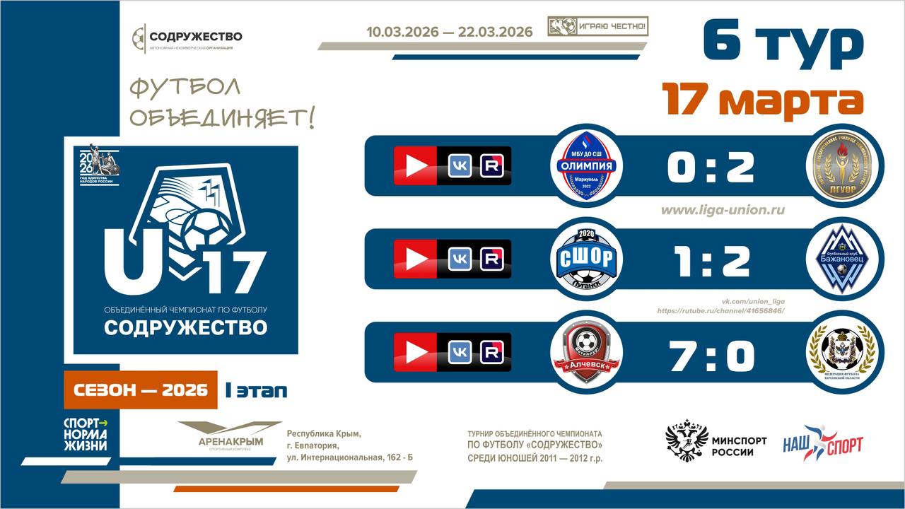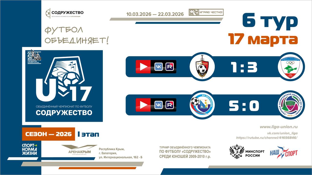 17 марта 2026 года в г. Евпатория состоялись матчи 5 тура I этапа турнира Объединённого чемпионата по футболу «Содружество» среди юношей 2009-2010 годов рождения (U-17).