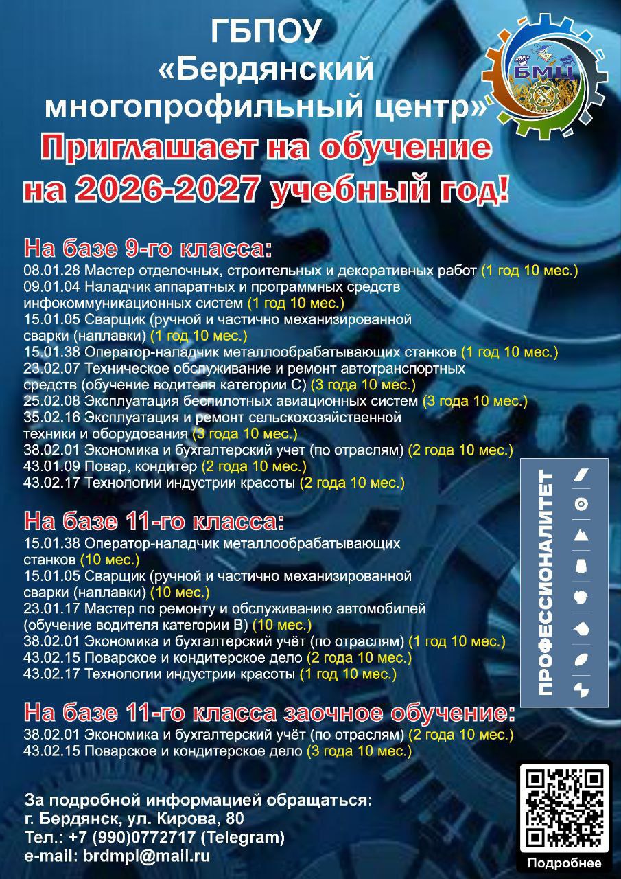 Дорогие выпускники 9-11 классов! Вы стоите перед выбором? И не знаете, КЕМ БЫТЬ в будущем?! "БЕРДЯНСКИЙ МНОГОПРОФИЛЬНЫЙ ЦЕНТР" приглашает на обучение!