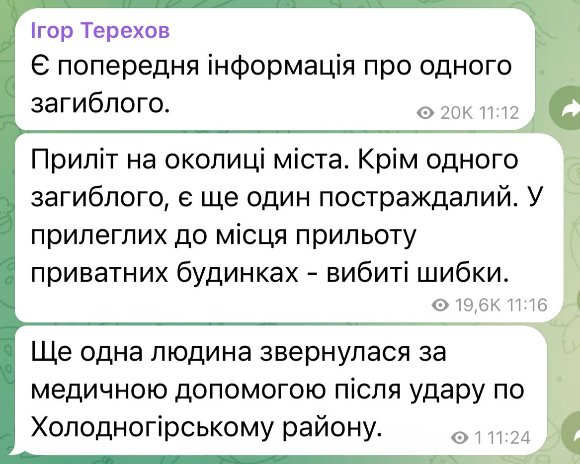 Харьков.... "Прилет на окраине города. Кроме одного погибшего, есть еще один пострадавший. В прилегающих к месту прилета частных домах - выбиты стекла", — Терехов