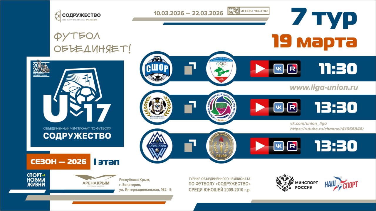19 марта 2026 года в г. Евпатория пройдут игры седьмого тура I этап турнира Объединённого чемпионата по футболу «Содружество» среди юношей 2009-2010 годов рождения (U-17).