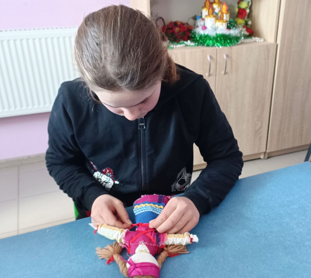 Затем ребята вместе с руководителем коллектива Евгенией Коровко попробовали изготовить такие куколки. Оказалось, что это им по силам — их творения вышли довольно милыми и симпатичными.