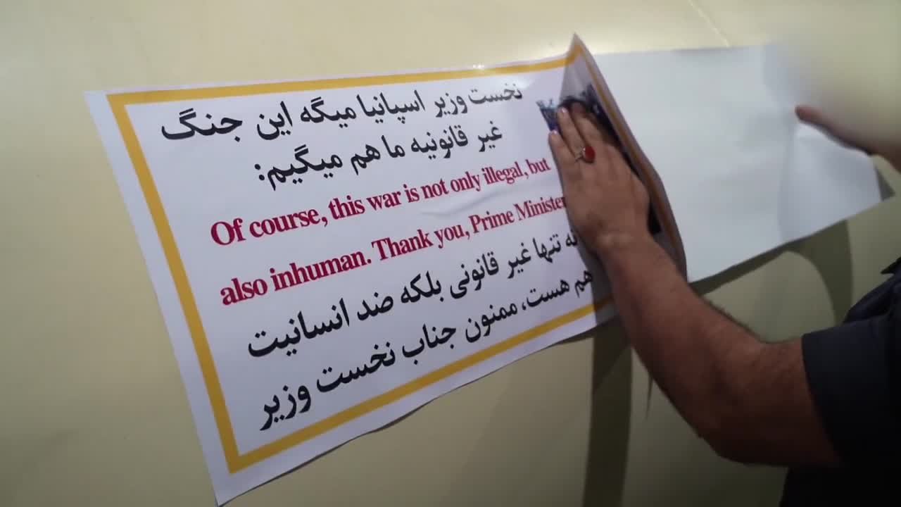 «Конечно, эта война не только незаконна, но и бесчеловечна. Спасибо, премьер-министр», — написано на одной из наклеек.
