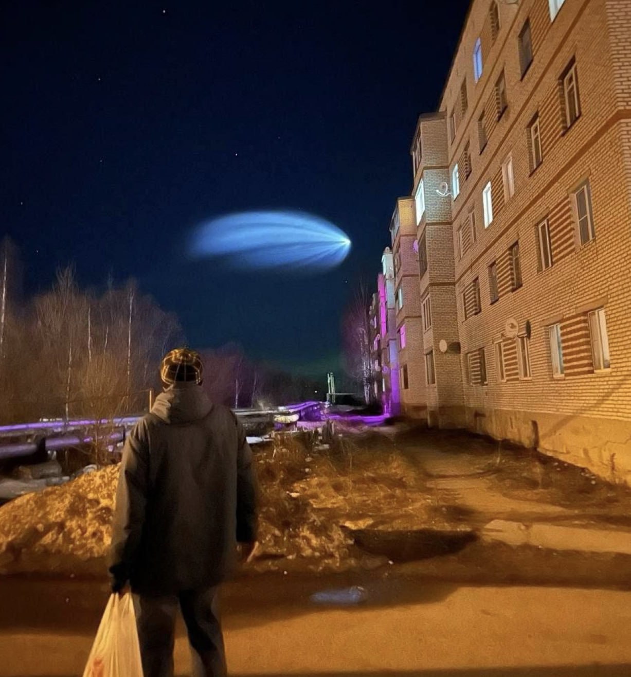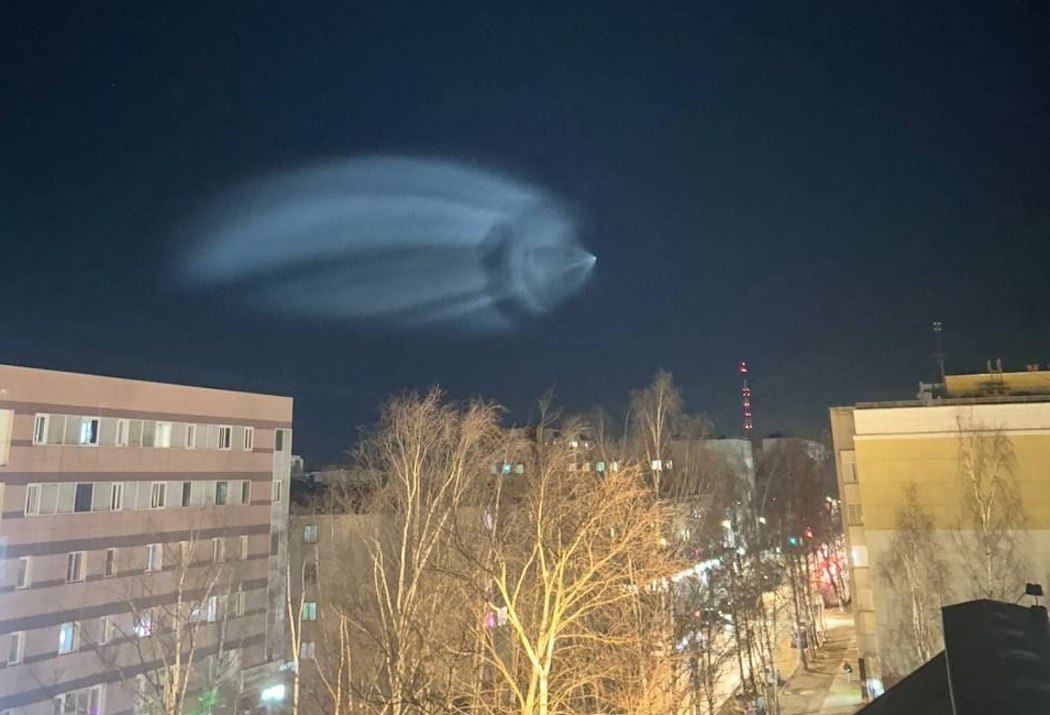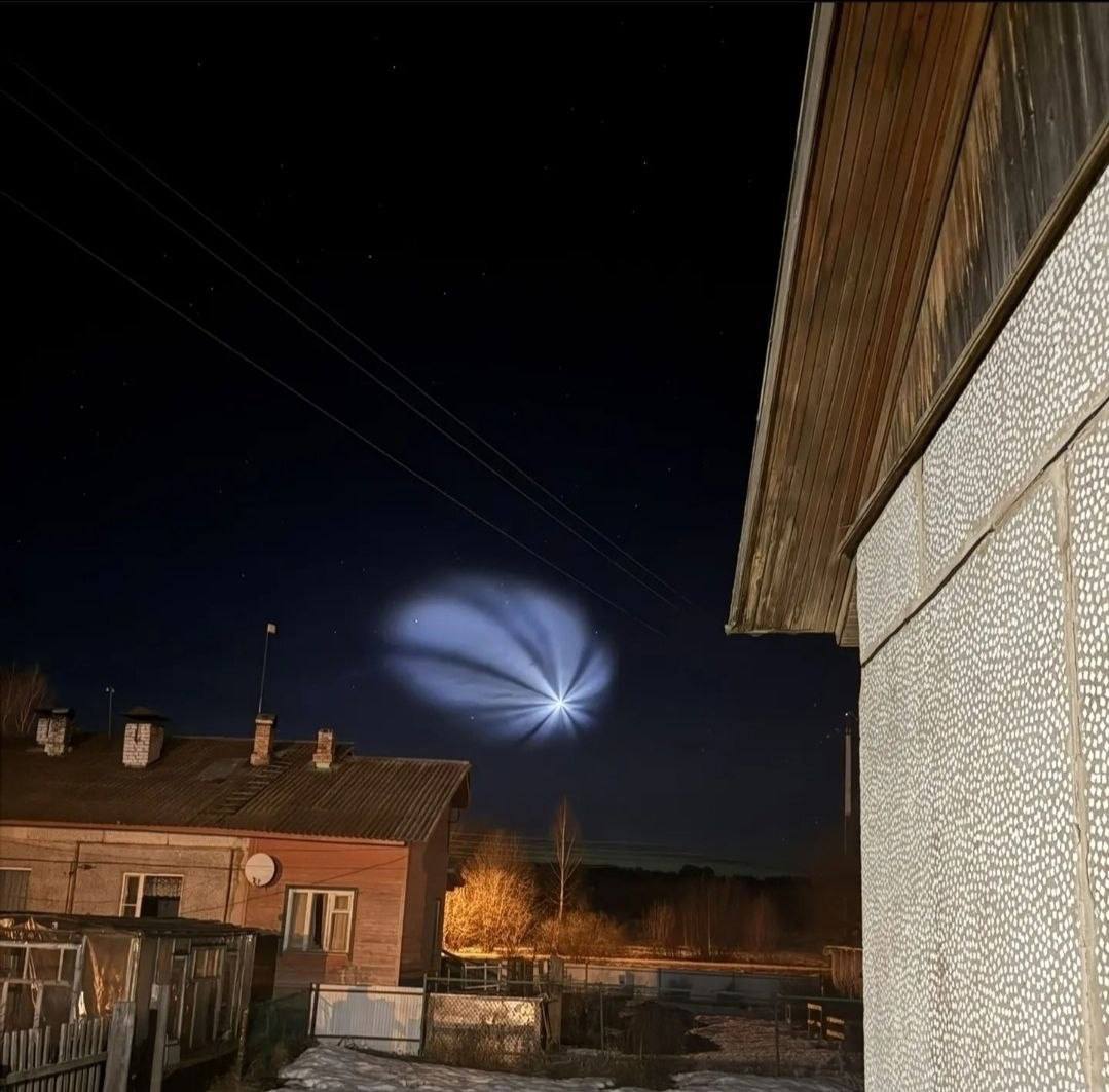 Ярко-голубой шлейф возник после выброса топлива на запуске ракеты «Союз-2.1б» с космодрома Плесецк, которая вывела на орбиту первую партию интернет-спутников «Бюро 1440» — отечественного аналога Starlink Илона Маска.