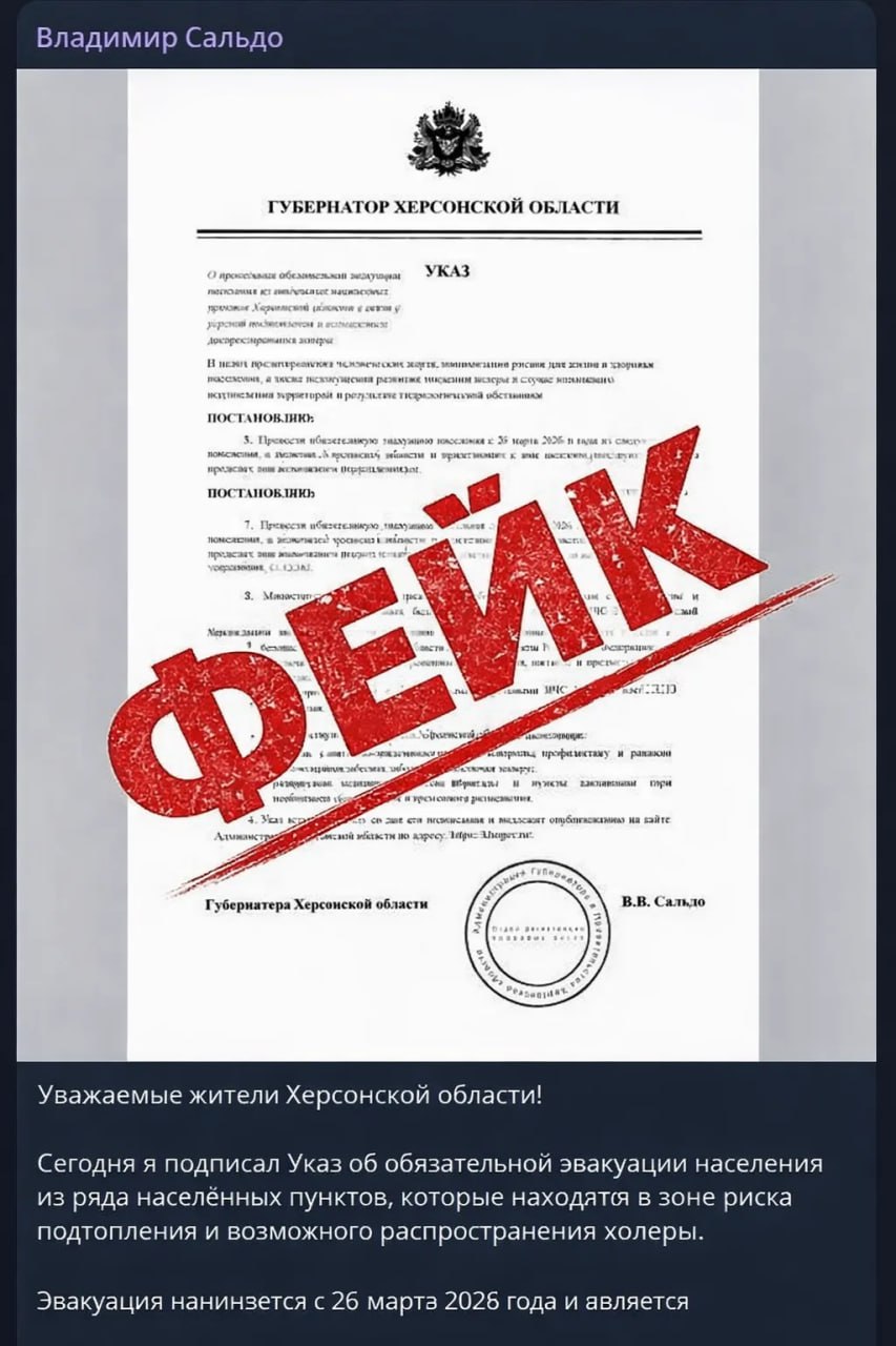 Никаких указов об обязательной эвакуации в Херсонской области не издавалось. Гидрологическая и эпидемиологическая обстановка стабильная — угроз подтопления и холеры нет.