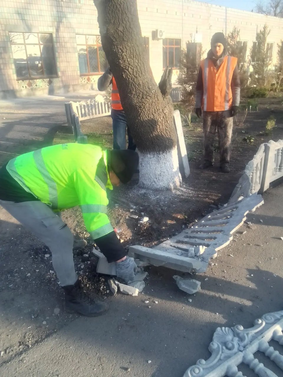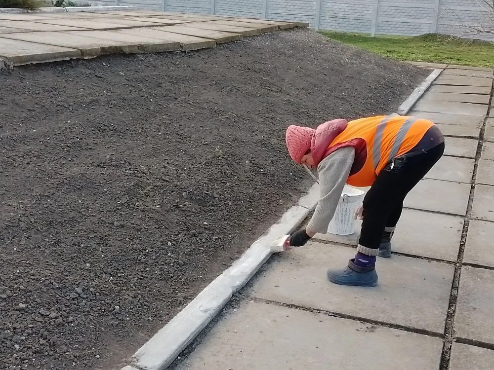 Проведена побелка бордюров.