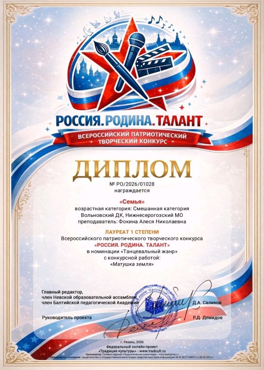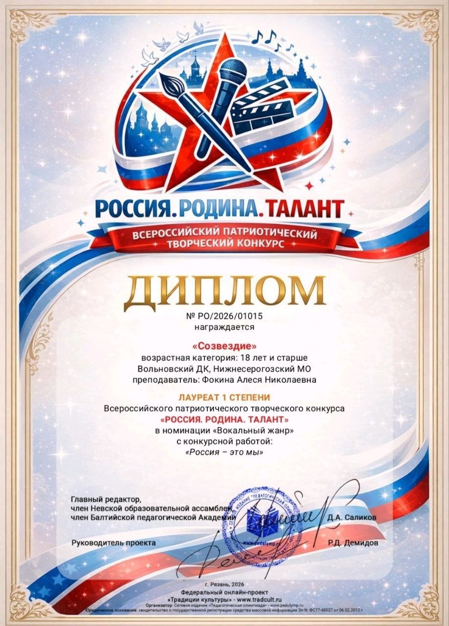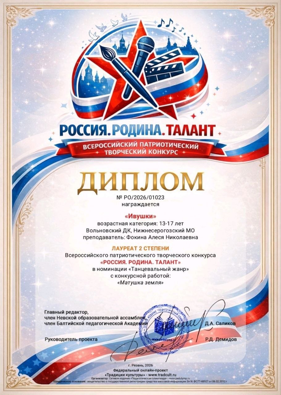 Под руководством заведующей Алеси Фокиной и художественного руководителя Умара Асатова Вольновский Дом культуры успешно выступил на Всероссийском конкурсе «Россия. Родина. Талант», подтвердив высокий уровень своего мастерства.