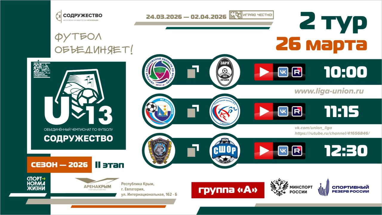 26 марта 2026 года в г. Евпатория состоится второй игровой день II этапа турнира Объединённого чемпионата по футболу «Содружество» среди детей 2013-2014 годов рождения (U-13).