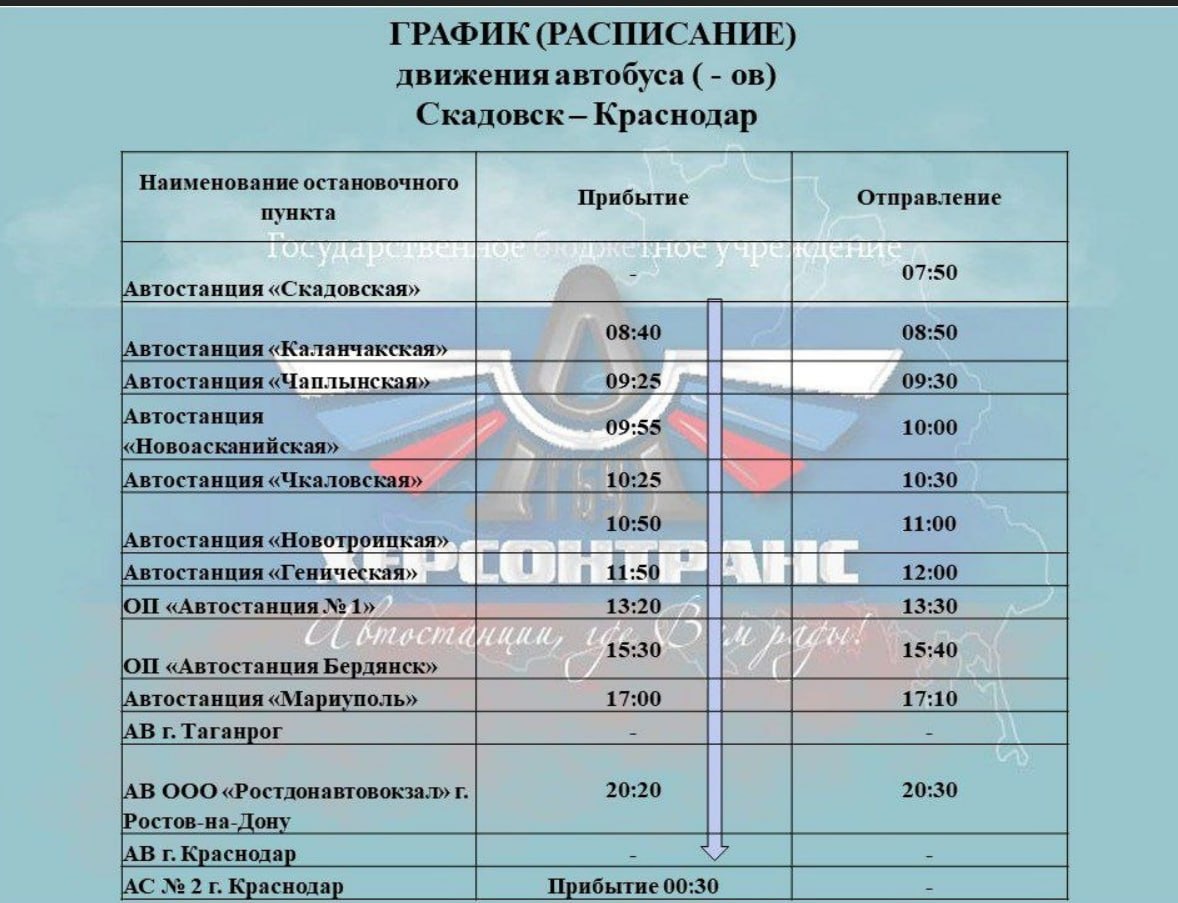Автобус отправляется в 07:50 с автостанции Скадовска, и прибывает в Краснодар в 00:30. Общее время в пути: 17 часов. Рейсы осуществляются через день.