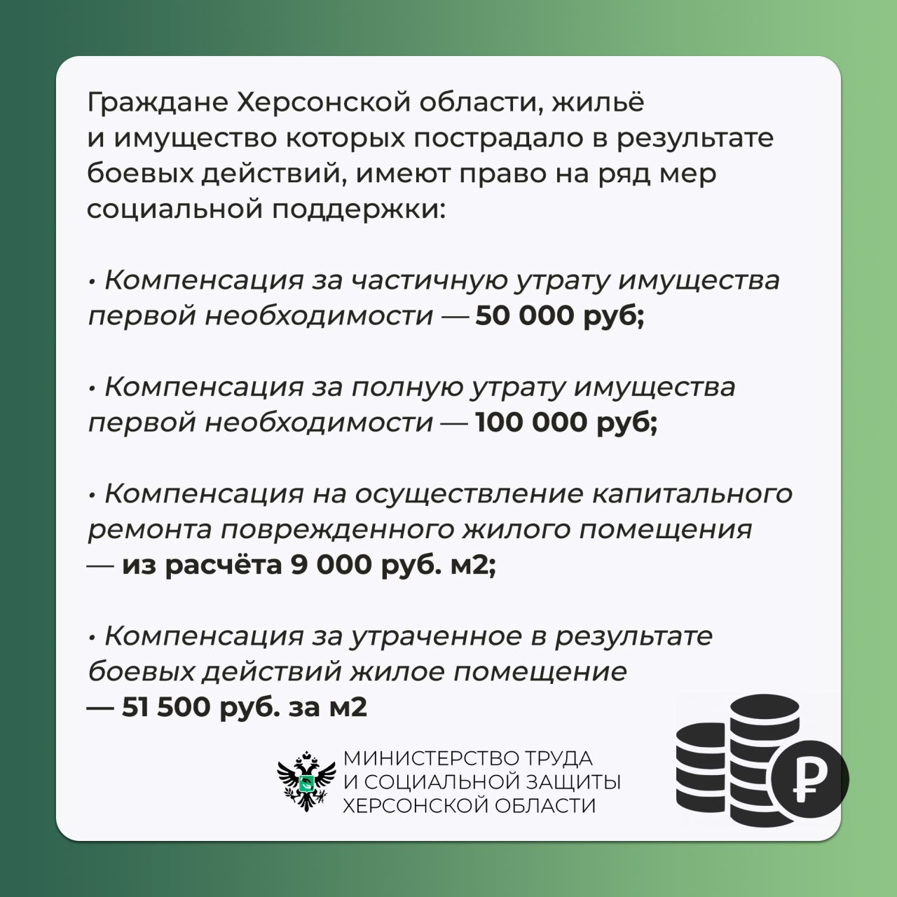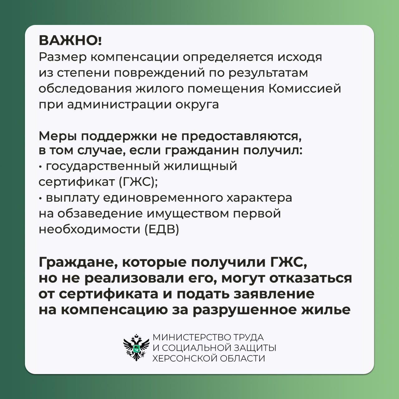 Граждане Херсонской области, жильё и имущество которых пострадало в результате боевых действий, имеют право на меры социальной поддержки.